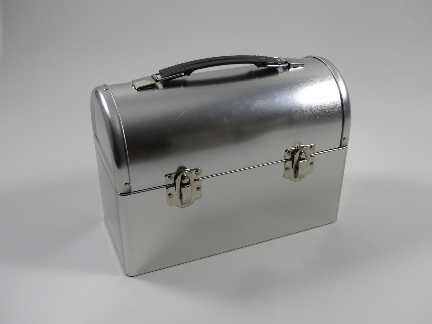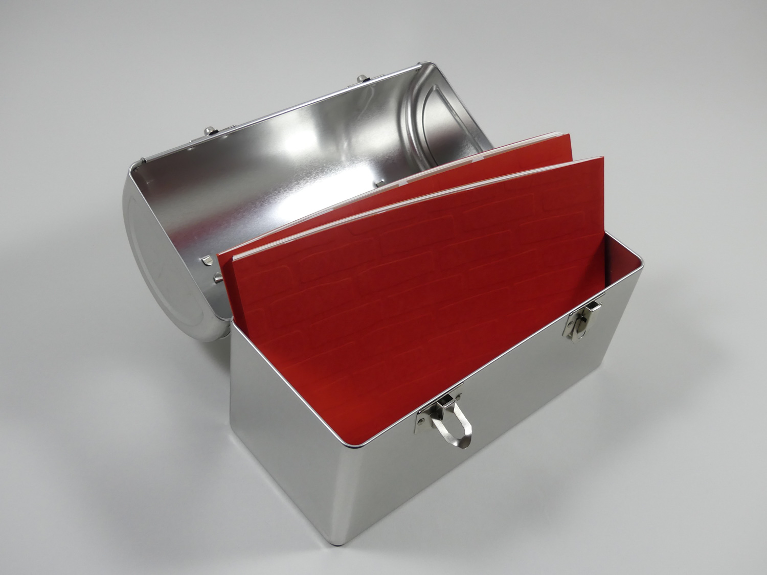 The books reside within a vintage metal lunchbox, which workers used when working on construction sites because of their sturdy structure and ability to keep debris out.